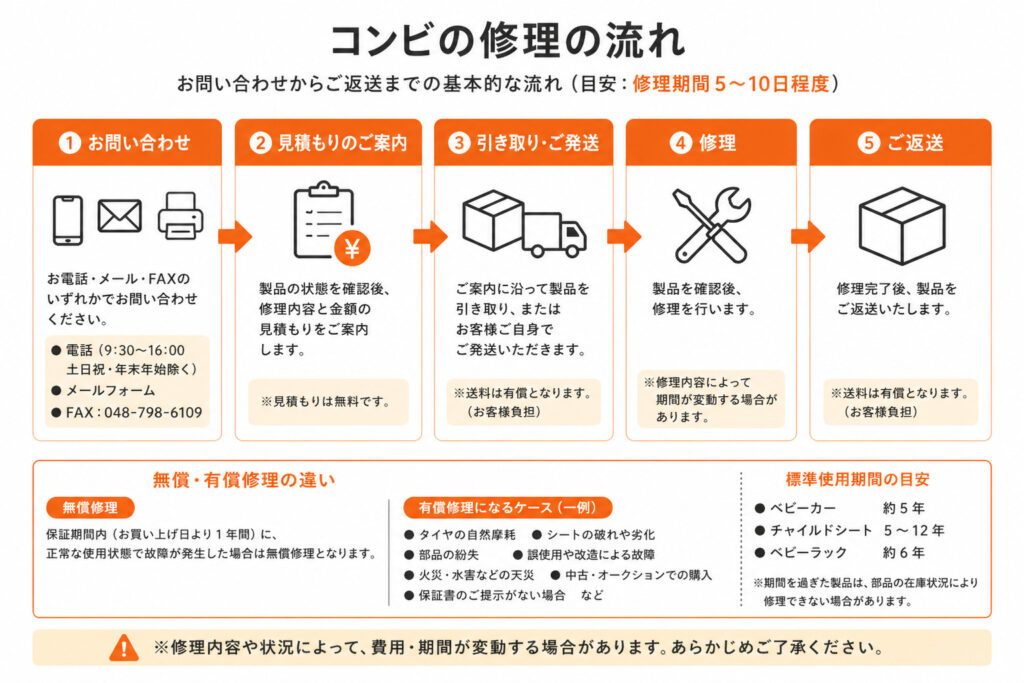 詳しく知りたい人は、コンビ公式サイト 修理のご依頼をご覧ください。